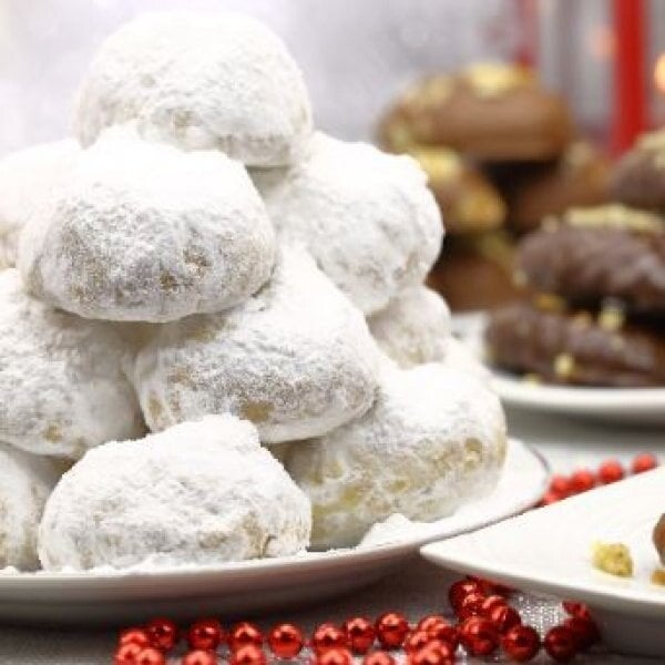 2. Kourabiedes (Κουραμπιέδες): Dit zijn boterachtige zandkoekjes die royaal worden bestrooid met poedersuiker. Ze bevatten vaak amandelen en soms een scheutje brandewijn of ouzo voor extra smaak.Ze worden geassocieerd met vreugde en festiviteit, vooral vanwege hun witte, sneeuwwitte uiterlijk.